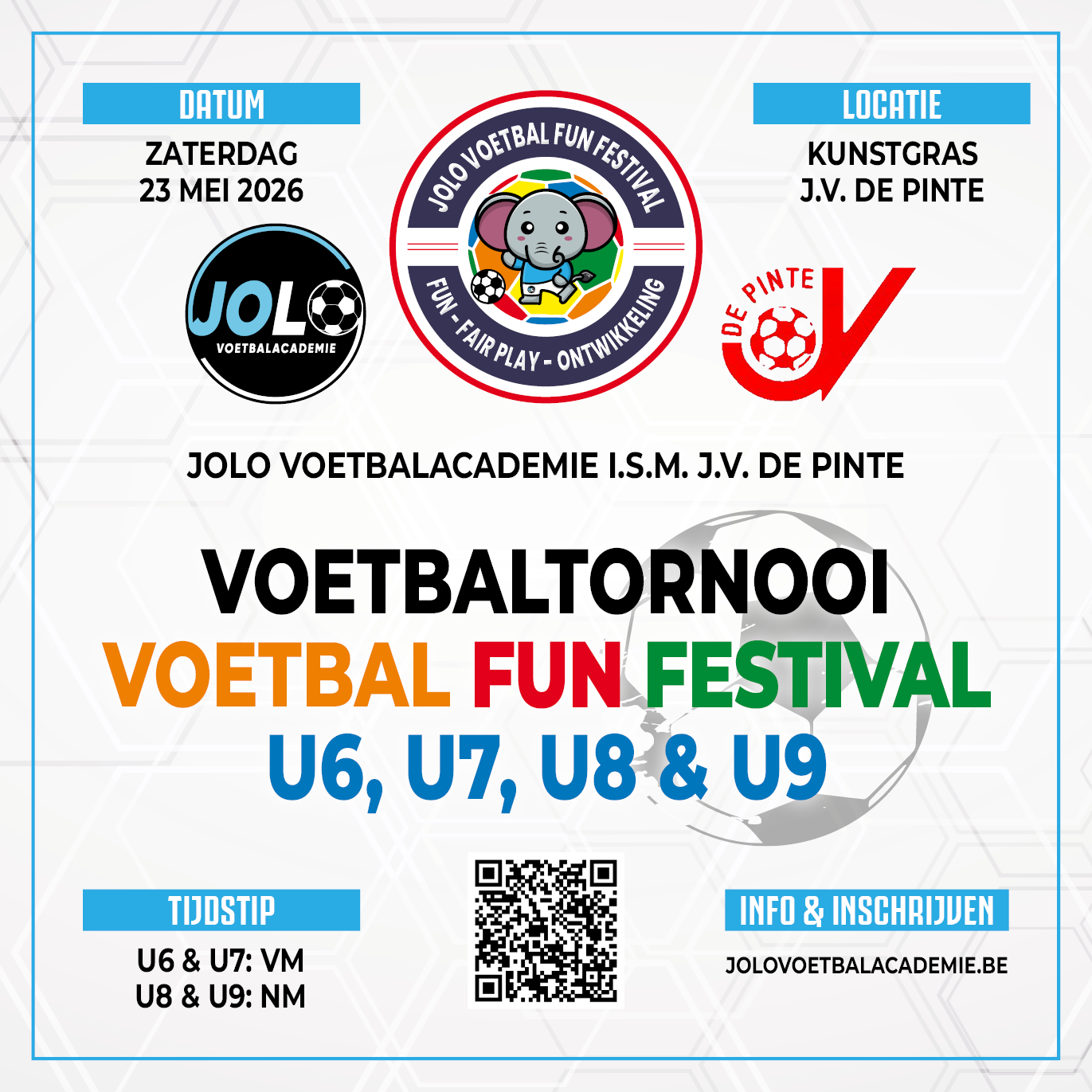 Op zaterdag 23 mei 2026 organiseert JOLO Voetbalacademie in samenwerking met J.V. De Pinte de vijfde editie van het Voetbal Fun Festival voor U6, U7, U8 en U9 op zowel gewestelijk als (inter)provinciaal niveau!